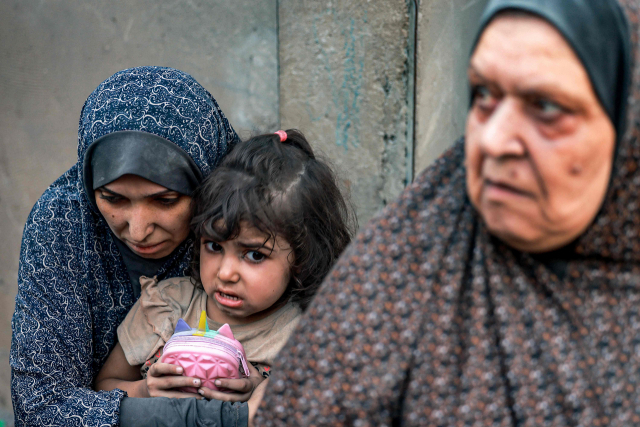 팔레스타인 무장 정파 하마스와 이스라엘 간 교전이 계속되는 가운데 6일(현지시간) 가자지구 라파에서 이스라엘 공습으로 겁에 질린 팔레스타인 가족이 무너진 주택 옆에 앉아있다. 이날 베냐민 네타냐후 이스라엘 총리는 인질 석방이나 구호품 전달 등을 위해 "전술적 일시 중지"를 검토할 것이라고 말했다. 연합뉴스