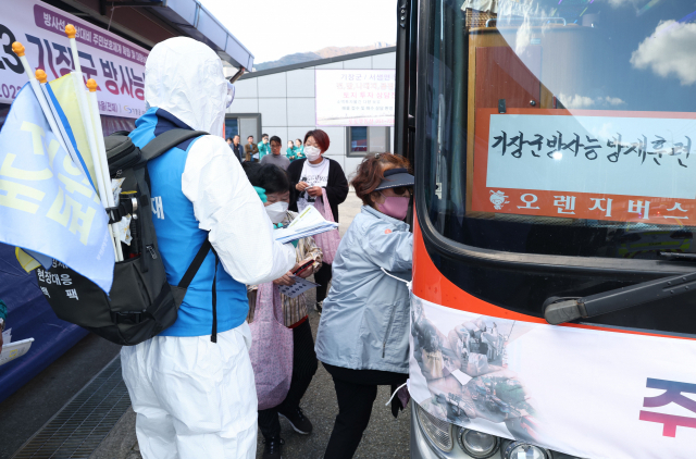 원자력발전소 사고 상황에 대비한 ‘2023년 방사능방재 주민 호조치 집중훈련’이 9일 부산 기장군청 주관으로 고리원전으로부터 4km 떨어진 부산 기장군 장안읍 시장마을 일대에서 실시됐다. ‘원자력시설 등의 방호 및 방사능방재대책법'에 따라 시행된 이번 훈련에서 적색 비상이 발령되자 주민들이 대피를 위해 버스에 탑승하고 있다.