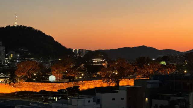 노을이 지면서 경남 진주시 원도심의 조명이 하나둘 켜지고 있다. 진주성 성벽 조명과 어우러진 타는 듯한 노을이 색다른 아름다움을 자아낸다.