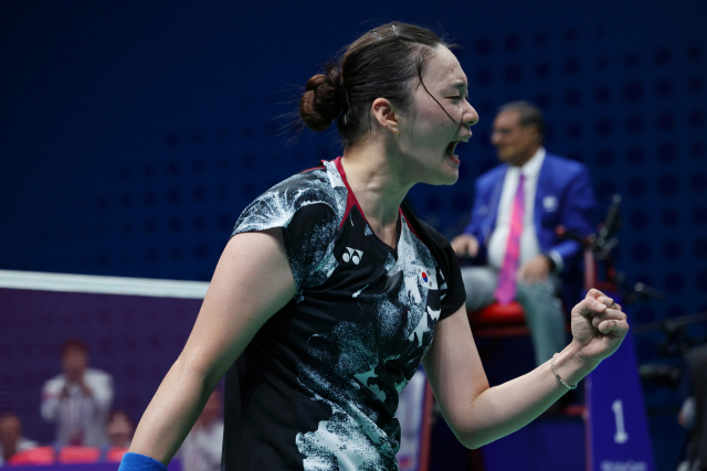 지난달 1일 중국 저장성 항저우 빈장체육관에서 열린 2022 항저우 아시안게임 배드민턴 여자 단체 결승에서 중국 허빙자오를 상대로 득점에 성공한 후 포효하고 있는 김가은. 김가은은 12일 열린 코리아마스터즈 여자 단식 결승에서 정상을 차지했다. 연합뉴스