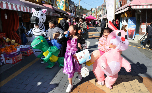12일 부산 동구 성북시장과 증산공원 일원에서 열린 ‘2023 부산 동구 웹툰 이바구길 축제’에서 어린이들이 만화 캐릭터 옷을 입고 축제를 즐기고 있다. 올해 축제는 전통시장인 성북시장 활성화를 위해 웹툰 전공 관련 부산지역 대학과 연계해 ‘만화 팝업 페스타’를 주제로 개최됐다.
