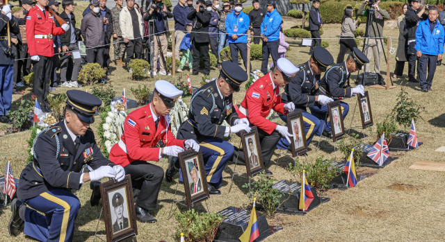 ‘턴 투워드 부산, 유엔 참전용사 국제추모의 날’ 행사가 열린 지난 11일 부산 남구 유엔기념공원에서 콜롬비아 참전용사 유해 안장식이 엄수되고 있다. 턴 투워드 부산은 6·25전쟁 유엔군 전몰 용사들이 묻힌 유엔기념공원을 향해 1분간 묵념하는 추모행사다.