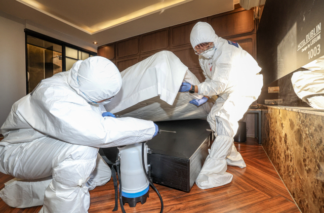 전국적으로 빈대 공포가 확산되는 가운데 13일 오후 부산 부산진구 한 숙박업소에서 부산진구 관계자와 방역업체가 빈대 발생에 대비한 특별점검과 방역을 하고 있다. 부산시는 시민 불안감 해소를 위해 이날부터 다음달 29일까지 지역 내 숙박업소 2016곳, 목욕장업소 708곳을 대상으로 숙박업소·목욕장업소 위생관리 특별점검을 펼친다.