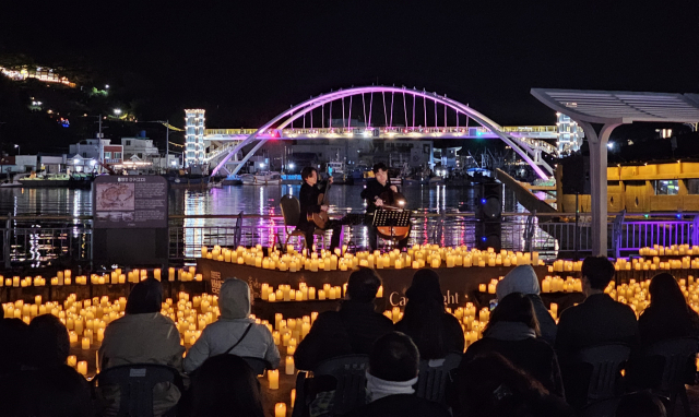 경남 통영시가 준비한 ‘캔들라이트 콘서트’가 지난 주말 성황리에 마무리됐다. 강구안 브리지를 배경으로 수천 개의 LED 캔들이 밤바다를 수놓았다. 통영시 제공