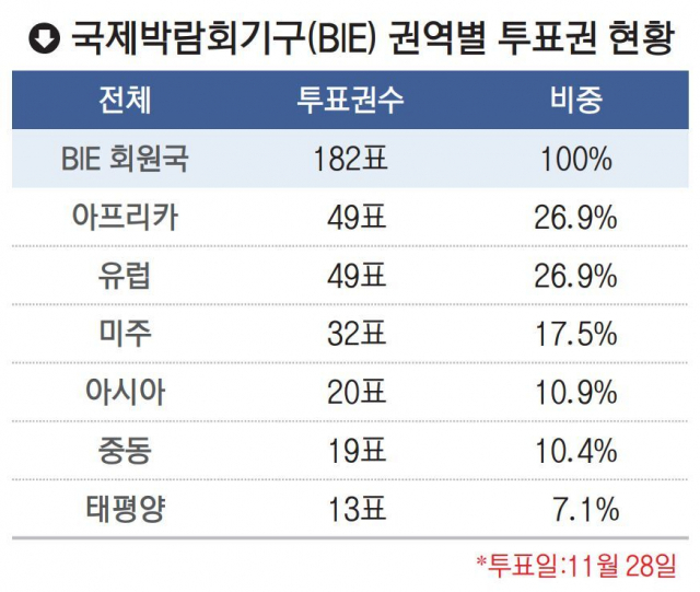 사우디가 이처럼 공을 들이는 아프리카는 2030엑스포 개최지 선정의 ‘캐스팅보트’로 통한다. 아프리카 54개 중 49개국이 BIE 회원국이어서 BIE 182개 회원국 가운데 26%가량을 아프리카 국가가 차지하기 때문이다. 아프리카와 유럽이 각각 49표로 가장 많다.