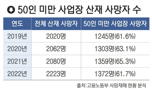 전체 산재 사망 사고자 수 중에서 50인 미만 사업장에서 목숨을 잃은 노동자 수는 △2019년 1245명(61.6%) △2020년 1303명(63.1%) △2021년 1359명(65.3%) △2022년 1372명(61.7%)으로 2019년부터 50인 미만 사업장 산재 사망 사고자 수는 증가하고 있다. 비율로 따져도 꾸준히 60%가 넘어, 50인 이상 사업장보다 50인 미만 사업장에서 산재 사고 사망자 수가 더 많은 것이다.