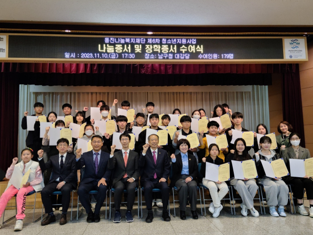 재단법인 동진나눔복지재단(이사장 박동천)은 지난 10일 부산 남구청 대강당에서 제6차 청소년 지원사업의 하나로 부산의 2개 구청, 4개 대학교, 1개 초등학교에서 선정된 초중고 학생 179명에게 나눔·장학증서를 수여하고 총 9950만 원의 장학금을 지원했다고 밝혔다.