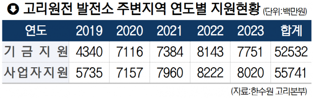 14일 한국수력원자력 고리원자력본부에 따르면 고리원전 인근 지역에 거주하는 주민을 위해 사용되는 원전지원금은 매년 100억 원을 훌쩍 넘는 것으로 나타났다. 정부는 ‘발전소 주변지역 지원에 관한 법률’에 따라 발전소 주변 5km 이내에 거주하는 주민을 위해 지자체에 발전 기금을 지원한다. 고리원전의 경우 기장군 일광읍, 장안읍 주민 9298명이 지원 대상이다. 사업자인 한수원도 기장군 주민의 복지를 위해 장학생 선발 사업, 지역 축제 지원 등 사업자 지원사업을 실시한다.
