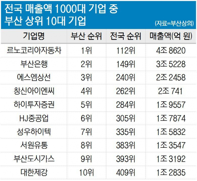 부산 기업의 위상 하락은 매출액에서 적나라하게 드러났다. 지난해 부산의 1000대 기업 28개사의 총 매출액은 36조 8220억 원이었다. 이는 전국 1000대 기업 전체 매출액의 1.2%에 불과하다.