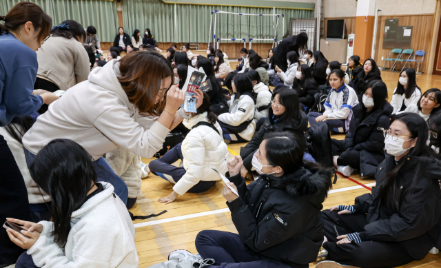 2024학년도 대학수학능력시험을 하루 앞둔 15일 부산 사상구 주례여고 강당에서 교사들이 고3 수험생들에게 수험표를 나눠 준 뒤 함께 파이팅을 외치고 있다.