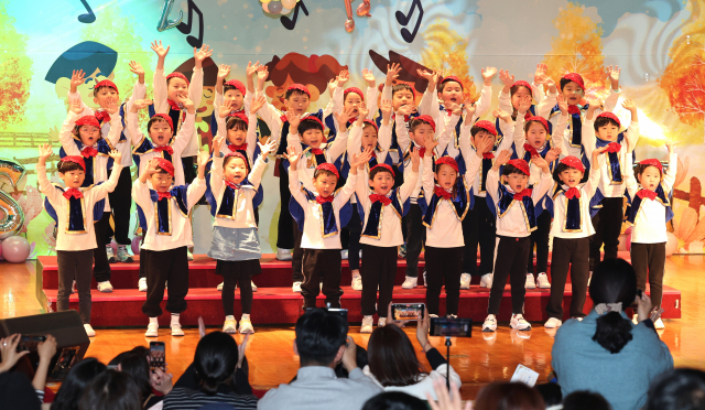 16일 오전 부산 부산진구청 대강당에서 열린 제8회 부산진구 꿈동이 동요제에 참가한 어린이들이 합창과 율동을 선보이고 있다. 동요제에는 12개 어린이집 230명의 어린이가 참가했다.