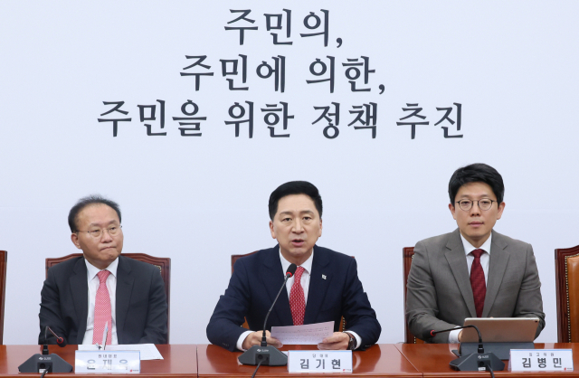 국민의힘 김기현(가운데) 대표가 16일 국회에서 열린 최고위원회의에서 발언하고 있다. 연합뉴스