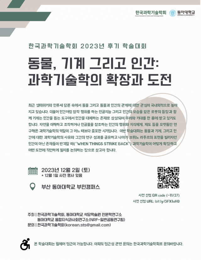 동아대 융합지식과사회연구소(소장 김주환 동아대 교수)도 참여하는 이번 학술대회는 ‘동물, 기계 그리고 인간 : 과학기술학의 확장과 도전’이란 주제로 이날 오전 10시부터 동아대 부민캠퍼스에서 열린다.