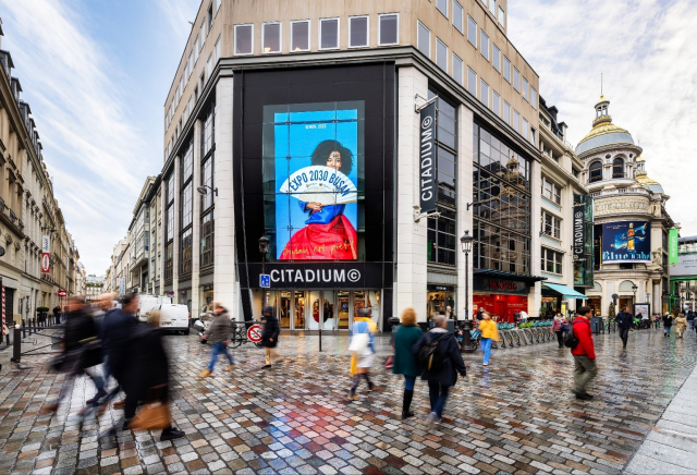 프랑스 파리 시내 대형쇼핑몰 '시타디움'의 외벽 스크린에 2030부산엑스포 유치 홍보 광고가 상영되고 있다. 부산시 제공
