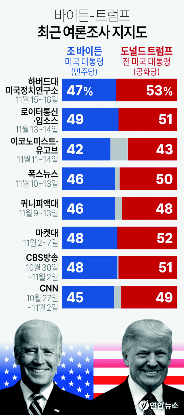 CBS뉴스와 CNN, 폭스뉴스, 마켓대 로스쿨, 퀴니피액대 등 주요 여론조사 5곳에서 트럼프 전 대통령 지지율이 바이든 대통령을 2~4%포인트 차이로 앞섰다. 현직 대통령이 주요 여론조사에서 모두 밀리는 것은 보기 드문 일이다.
