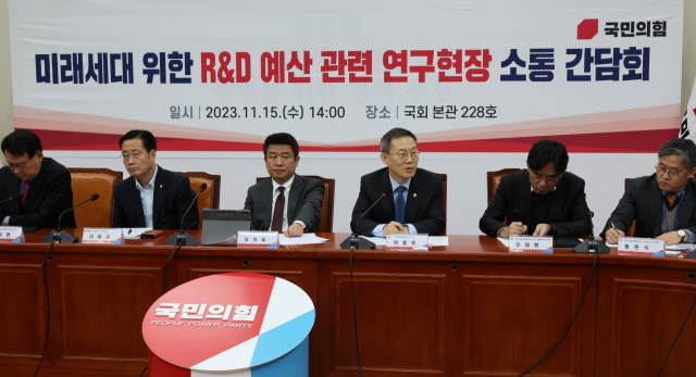 여야가 예산안 편성과 관련 상대 진영의 ‘폭주’를 비판하며 공방전을 이어가고 있다. 지난 15일 국회 국민의힘 회의실에서 열린 ‘미래세대 위한 R&D 예산 관련 연구현장 소통 간담회’ 모습(위)과 같은 날 대전에서 열린 더불어민주당 현장 최고위원회의에서 이재명 대표가 R&D 예산 관련 발언을 하는 모습. 연합뉴스
