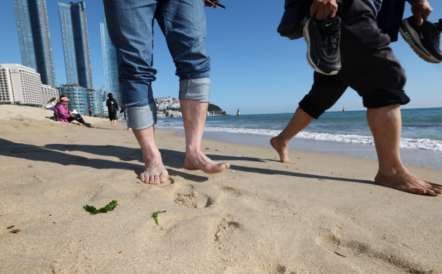 부산 해운대해수욕장에서 맨발 걷기를 즐기는 시민들. 정종회 기자 jjh@
