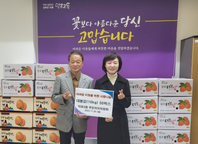 사상구 덕포2동(동장 남은숙)은 지난 20일 주민자치위원회(위원장 송창호)로부터 어려운 이웃들을 위한 대봉감(10kg) 50박스를 전달받았다.