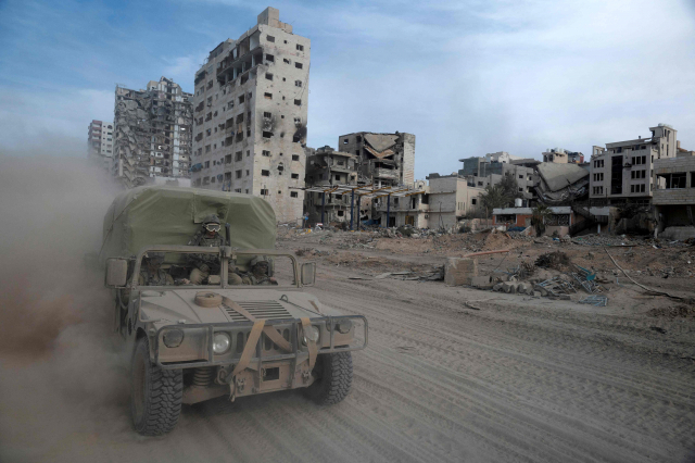 이스라엘과 팔레스타인 무장정파 하마스의 임시휴전 합의가 24일(현지 시간) 이후에 효력이 발생할 전망이다. 22일 가자지구에서 이스라엘 군용 험비 차량이 이동하고 있다. 연합뉴스
