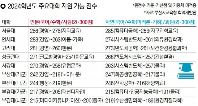 부산 지역 대학들의 지원 가능 점수는 소폭 하락할 것으로 예상한다. 부산대의 경우 인문 계열과 자연 계열 모두 1~2점가량 하락할 것으로 예상했다. 부경대의 경우 인문 3~5점, 자연 4~5점이 낮아질 것으로 예상한다. 동아대 역시 인문 3~5점, 자연 4~6점 하락할 전망이다.