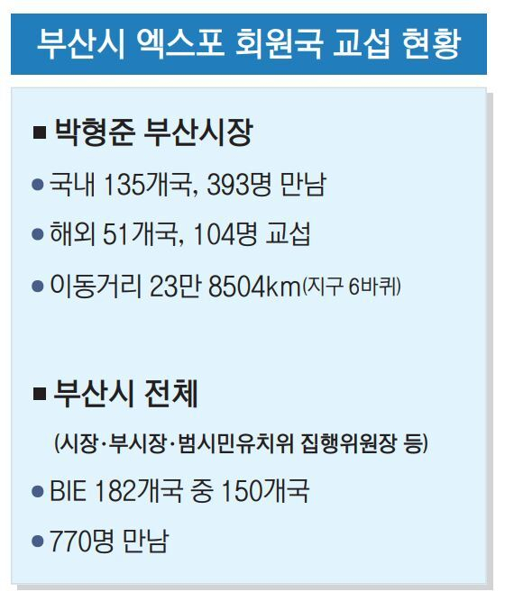 특히 엑스포 유치의 최선봉에 선 박형준 부산시장은 ‘엑스포도시 부산’의 꿈을 이루기 위해 혼신의 힘을 쏟고 있다. 부산시에 따르면 2021년 6월 부산이 엑스포 도전장을 던진 후 이달까지 박 시장이 엑스포 유치를 위해 이동한 거리만 23만 8504km로, 지구 6바퀴를 돈 거리에 달한다. 국내에서 135개국, 393명의 회원국 인사를 만났고, 해외에서는 51개국 104명과 유치 교섭을 진행했다. 박 시장이 직접 만나 지지를 호소한 해외 인사만 143개국, 497명에 달한다.
