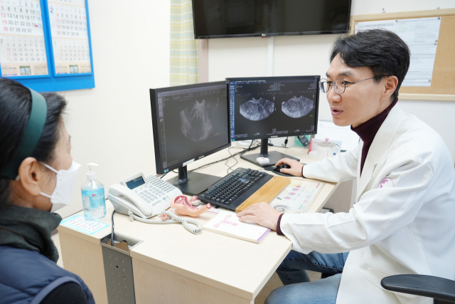 자궁근종은 35세 이상 여성 40~50%에서 발견되는 흔한 여성질환이지만, 뚜렷한 증상이 없는 경우가 많아 정기적 검진과 관찰이 중요하다. 동아대병원 산부인과 박정우 교수가 환자를 진료하고 있다. 동아대병원 제공