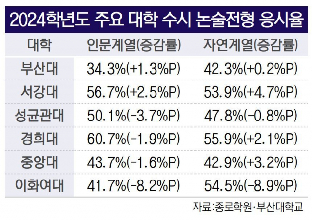 ‘불수능’으로 평가받고 있는 2024학년도 대학수학능력시험(수능)의 영향으로 주요 대학 수시모집 논술 응시율이 요동친 것으로 확인됐다. 인문 계열 응시율은 하락한 반면, 자연 계열 응시율은 대부분 상승한 것으로 나타났다. 인문 계열은 수시모집에서 수능 최저등급을 충족하지 못한 학생이 속출할 것으로 보여, 정시 모집에도 큰 영향을 미칠 것으로 예상된다.
