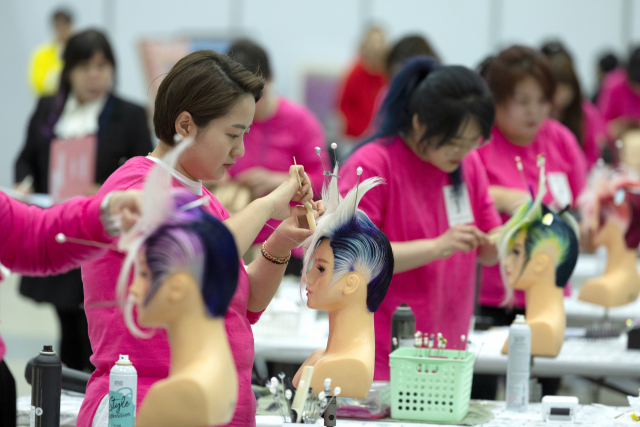 ‘2023 부산 미(美)아트 페스티벌’이 28일 부산 해운대구 벡스코 제2전시장에서 열렸다. 미용 기능경진대회 헤어 부문에 출전한 미용인들이 기량을 겨루고 있다.