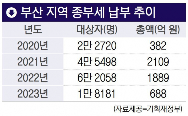 부산의 주택 종부세는 △2020년 2만 2720명 382억 원 △2021년 4만 5498명 2109억 원 △2022년 6만 2058명 1889억 원 등으로 2021~2022년에 크게 불어난 바 있다.