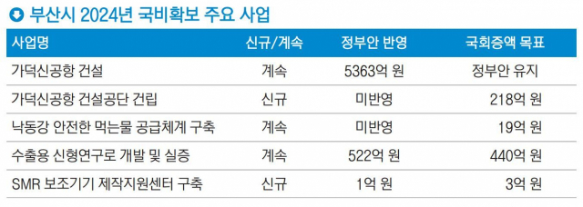 29일 국회 예산결산특별위원회와 부산시 등에 따르면 국회의 2024년도 예산 심사와 관련, 부산시는 ‘핵심 사업’으로 가덕신공항 건설, 수출형신형연구로 개발, 소형모듈원자로(SMR) 보조기기 제작지원센터 구축 등을 선정했다.