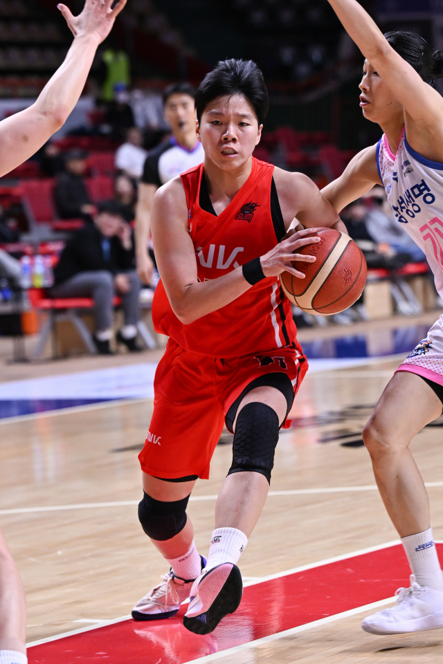 BNK 진안이 29일 부산 사직실내체육관에서 열린 홈 경기에서 삼성생명 수비를 뚫고 돌파를 시도하고 있다. WKBL