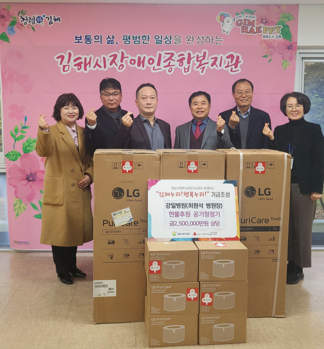 이번 현물 후원은 강일병원(병원장 최원석)에서 행복 나눔 바자회 행사를 운영한 수익금을 김해시장애인종합복지관 직업지원 훈련생 작업실에 공기청정기 3대와 필터 3세트를 기탁하여 작업실의 쾌적한 환경을 위해 제공하였다고 했다.