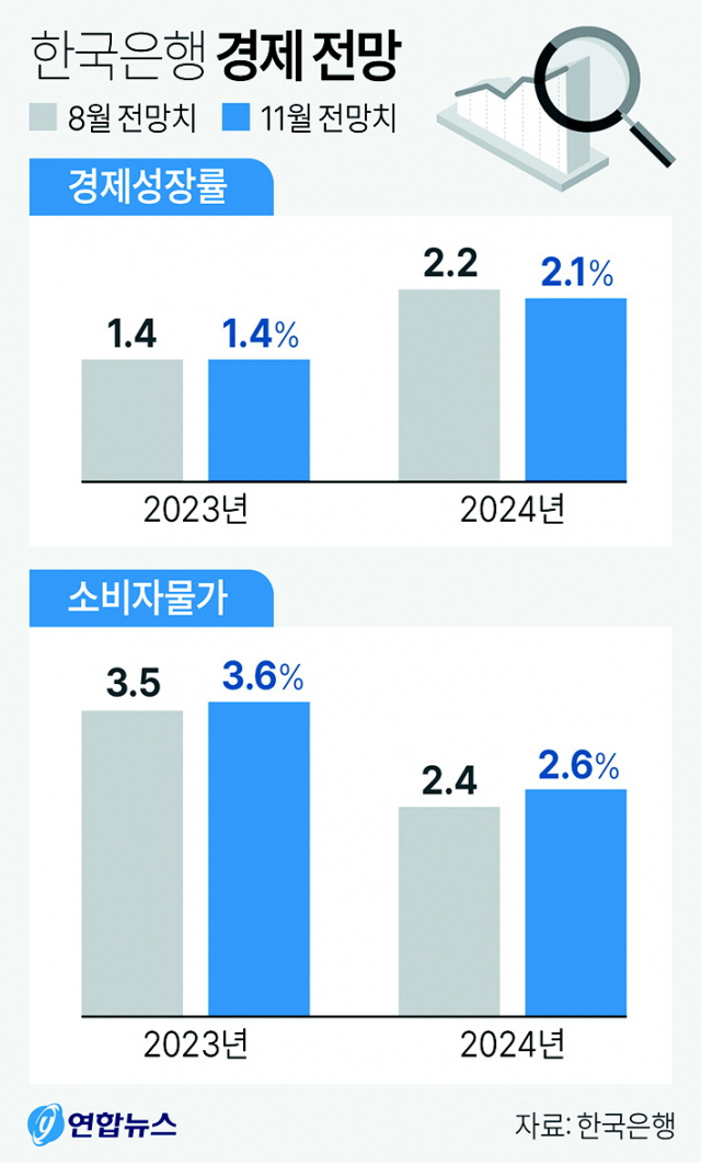 국내 경기에 대해서는 "앞으로 수출 회복세 지속 등으로 개선 흐름을 이어갈 것"이라며 "올해 성장률은 8월 전망치에 부합하는 1.4%로 예상되고 내년 2.1%로 높아지겠지만, 국내외 통화긴축 기조 장기화와 더딘 소비 회복세 영향으로 지난 전망치(2.2%)를 소폭 하회할 것"이라고 진단했다.