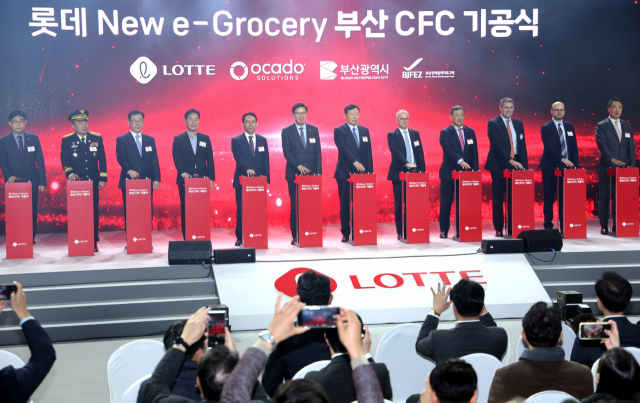 롯데쇼핑은 5일 오후 부산 강서구 미음동 국제산업물류센터에 위치한 ‘고객 풀필먼트 센터(CFC·자동화 물류센터)’ 부지에서 기공식을 열었다고 밝혔다. 이날 기공식에는 박형준 부산시장을 비롯해 신동빈 롯데그룹 회장, 팀 스테인 영국 오카도 최고경영자, 김기영 부산진해경제자유구역청장 등이 참석했다.
