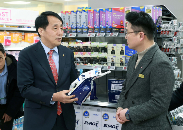 요소수 관련 현장 점검에 나선 장영진 산업통상자원부 제1차관이 6일 오후 서울 송파구 롯데마트 월드타워점에서 박석재 점장의 설명을 들으며 진열된 상품을 살펴보고 있다. 산업부 제공