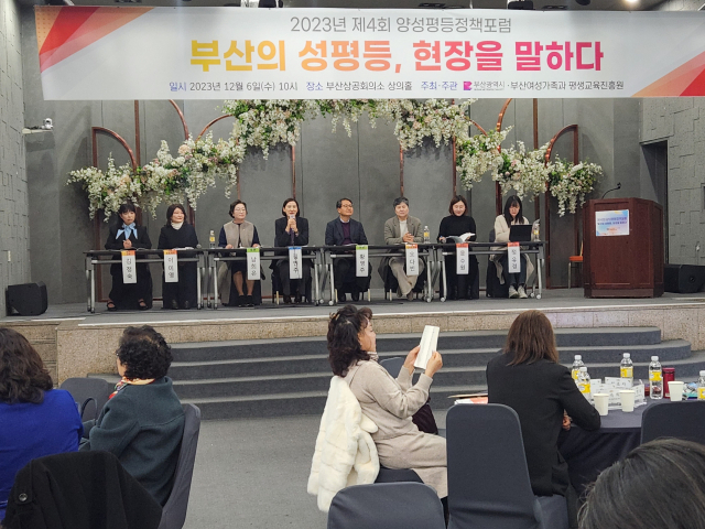 6일 오전 부산 부산진구 범천동 부산상공회의소에서 2023년 제4회 양성평등정책포럼 ‘부산의 성평등, 현장을 말하다’가 개최됐다. 올해 출범한 ‘부산여성가족개발원(현 부산여성가족과 평생진흥원) 양성평등정책포럼 2기’ 일자리·경제, 과학·기술, 문화·예술, 돌봄·복지, 교육 등 5개 분과 총 50여 명의 위원이 활동한 결과를 갈무리하는 자리였다.