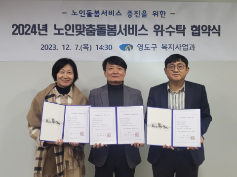 부산시 영도구(구청장 김기재)는 12월 7일 영도구청에서 2024년 노인맞춤돌봄서비스 수행기관 2개 기관(영도구노인복지관, 와치종합사회복지관)과 업무 재위탁 협약을 체결했다.