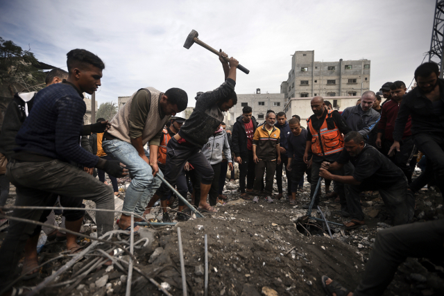 지난 7일(현지시간) 이스라엘의 공습을 받은 가자지구 남부 칸유니스 난민촌에서 주민들이 생존자를 찾기 위해 콘크리트 건물 잔해를 부수고 있다. AP연합뉴스