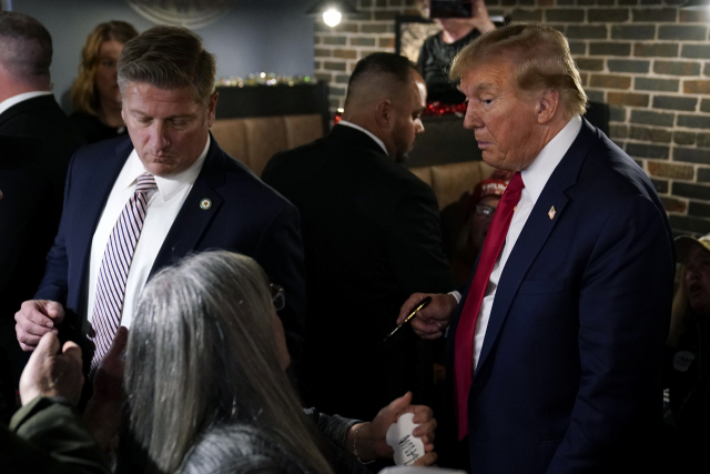 도널드 트럼프 전 대통령이 5일 아이오와주에서 지지자에게 사인하고 있다. AP연합뉴스