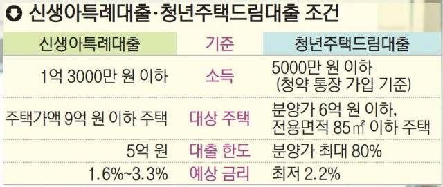 9억 원 이하 주택에 한해 최대 5억 원까지 빌려주는데 금리는 역대 특례 대출 중 가장 낮은 수준인 연 1.6~3.3% 수준이다. 소득 요건(자산 요건은 5억 원 이하)은 저·중소득층 대상 상품인 디딤돌대출의 2배 이상인 1억 3000만 원 이하가 대상이다. 특례 대출 후 추가로 아이를 낳으면 신생아 1명당 0.2% 포인트씩 금리를 깎아준다. 정부는 최장 15년(아이 2명 출산 시) 특례 금리를 추가로 적용받을 수 있게 설계했다. 전세대출의 경우 연소득 1억 3000만 원 이하 가구(자산 3억 6000만 원 이하)에 3억 원의 전세자금을 빌려준다. 금리는 연 1.1~3%이고 특례 금리는 4년 간 적용된다.