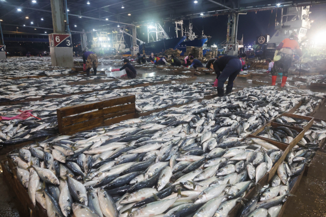 올 8월 부산 서구 공동어시장에서 부산항운노조 소속 부녀반원들이 배에서 내린 고등어를 크기에 따라 나무 상자에 분류하고 있다. 정종회 기자 jjh@