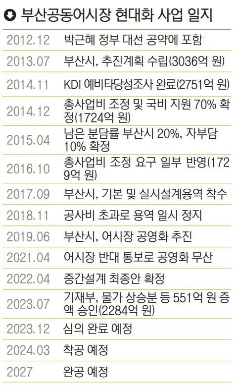 어시장 현대화 사업은 2012년 박근혜 정부 공약에 포함되며 본격 시작됐다. 2013년 시가 추진계획안을 마련하고 이듬해 예비타당성 조사까지 마쳤다. 하지만 어시장 내 복잡한 이해관계와 시의 조율 실패 등의 이유로 공전을 거듭했다. 2019년에는 시가 공영화를 추진하기도 했지만 이마저 논의 끝에 백지화됐다. 2021년 시와 어시장은 현대화사업을 재개하기로 했으며, 올해 기재부가 물가 상승분 555억 원 증액을 승인해 다시 궤도에 올랐다. 총 사업비 2284억 원 중 국비로 70%가 지원된다. 나머지는 시가 20%, 어시장이 10%를 부담한다.
