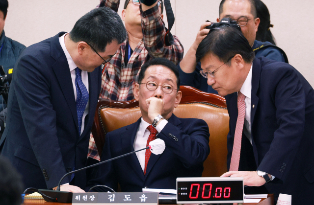 김도읍 국회 법제사법위원장(가운데), 국민의힘 정점식 간사(오른쪽)와 더불어민주당 소병철 간사가 7일 오후 국회에서 열린 법제사법위원회 전체회의에서 이야기를 나누고 있다. 연합뉴스