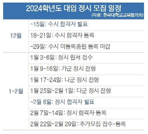 수험생들은 가·나·다 군별 1개 대학씩 최대 3회 지원할 수 있다. 정시모집 합격자 발표는 내년 2월 6일까지 이뤄진다. 각 대학은 내년 2월 29일까지 추가 합격자 발표와 등록을 끝으로 정시모집을 마친다.