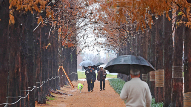 이례적인 따뜻한 겨울 날씨 속에 비가 내린 11일 오후 부산 부산진구 송상현광장 메타세쿼이아 가로수 길을 시민들이 우산을 쓰고 걸어가고 있다. 기상청은 주 후반부인 목요일부터 금요일까지 저기압의 영향으로 다시 전국에 비가 온 뒤 토요일인 16일부터 기온이 급격히 떨어질 것으로 예보했다.