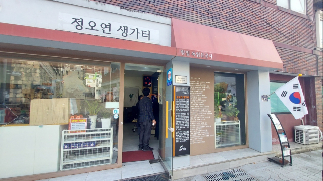 역사 기행 동호회 노랑배낭이 지난 9일 진행한 사부작 동구 번개 역사 기행 첫 방문지로 찾은 좌천동 정오연 생가터. 구멍가게 한 켠에 독립유공자 정오연 관련 기록물이 전시돼 있다. 김희돈 기자