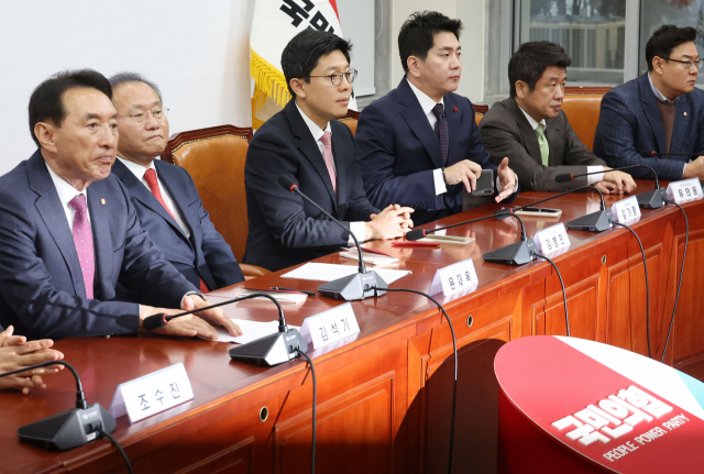 국민의힘 김기현 대표가 사퇴한 다음날인 14일 윤재옥 원내대표 겸 대표 권한대행(왼쪽 두번째)과 지도부가 국회에서 최고위원회의를 갖고 있다. 연합뉴스