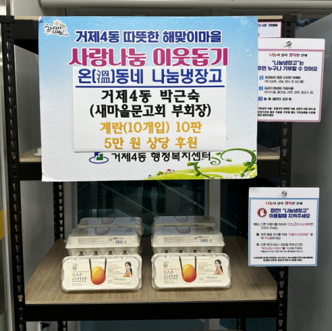 연제구 거제4동(동장 박동화)은 지난 12일 박근숙 새마을문고회 부회장으로부터 저소득주민의 식생활 안정을 위한 온(溫)동네 나눔냉장고에 식료품(계란 10판, 5만 원 상당)을 기탁받았다.