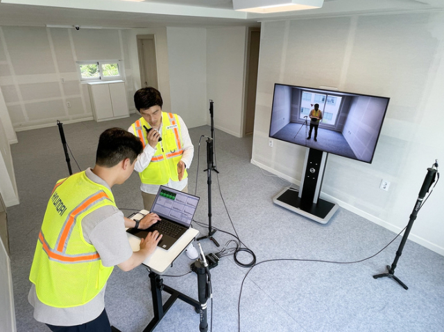 현대건설 관계자들이 층간소음 실증시설인 ‘H 사일런트 랩’에서 임팩트 볼을 활용한 테스트를 진행하고 있다. 현대건설 제공