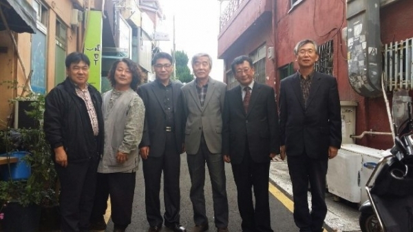 2014년 10월 부산 중앙동에서 오랜만에 만난 ‘시와 인간’ 동인들. 사진 왼쪽부터 이창희 박병출 최영철 허철주 류명선 조해훈 시인. 조해훈 제공